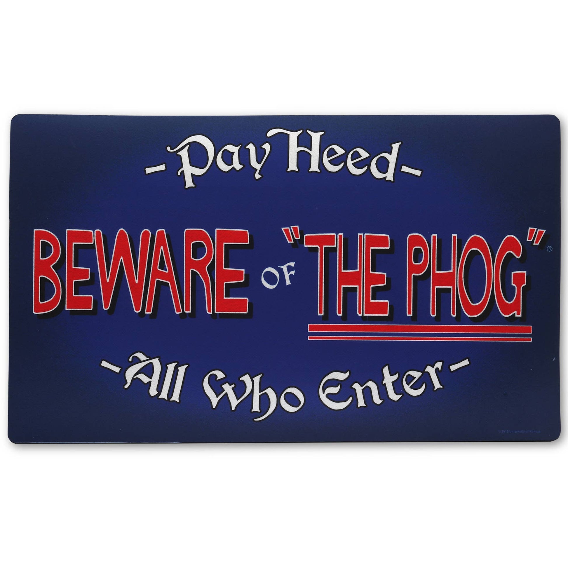 University of Kansas official product: Another year, another Late Night in the Phog! This fun tribute to KU tradition reads, "Pay Heed All Who Enter - Beware of "the Phog," a reference to "Phog" Allen and his celebrated legacy at KU.